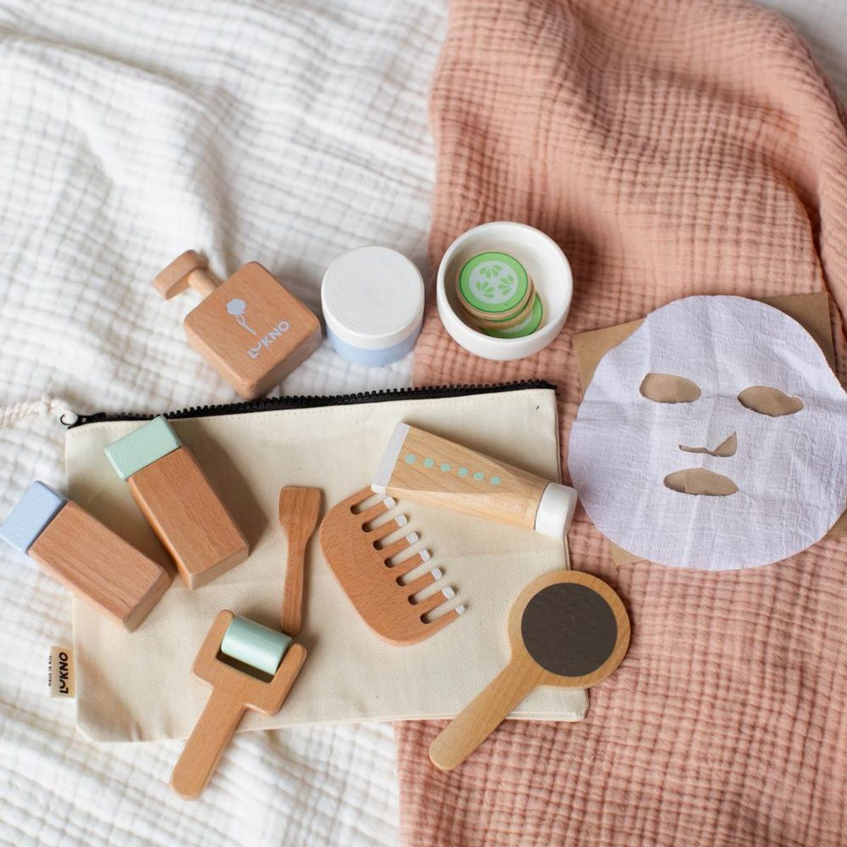 В этом замечательном наборе есть всё, что нужно для домашнего спа-салона, в который ваша девочка будет играть с удовольствием. Деревянные бутылочки с духами, мисочки, ложечки, зеркало и гребешок - всё это поможет повторить те процедуры, которые делают в настоящем салоне красоты. В тканевой косметичке есть даже маска, ломтики огурца и тюбики и баночки с кремом. Игровой набор выполнен из натуральной древесины и хлопкового текстиля, окрашен безвредными и нетоксичными красками, очень удобен и долговечен в игре.